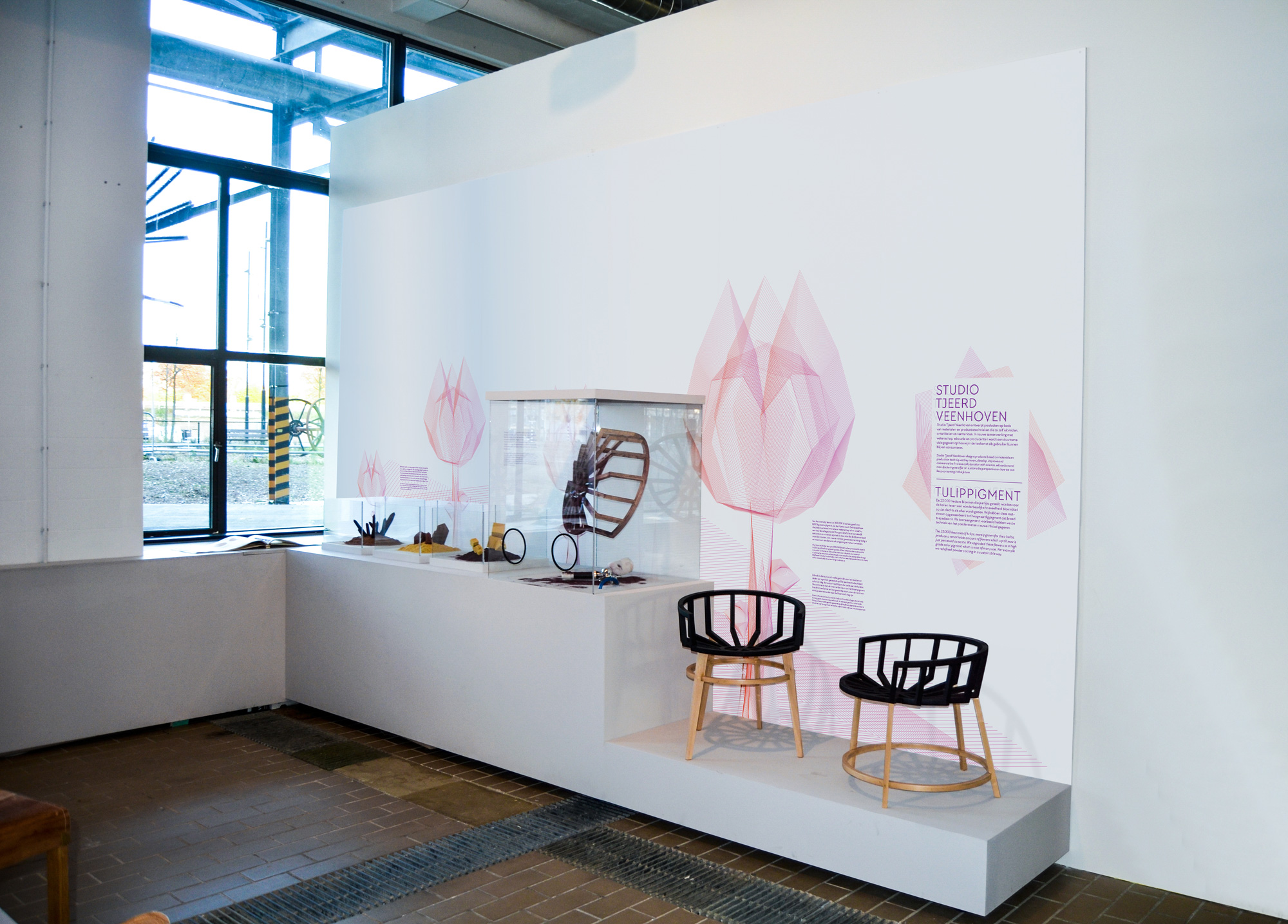 Ontwerp stand van Studio Tjeerd Veenhoven tijdens de Dutch Design Week over zijn Tulippigment en PalmLeather.